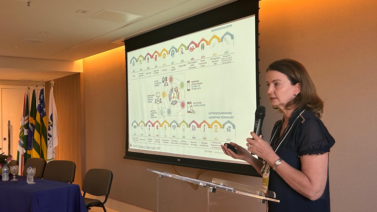 A palestrante também ressaltou o papel das instituições de pesquisa no fortalecimento da Avaliação de Tecnologias em Saúde (ATS). Entre elas, destacou o Centro de Excelência e Tecnologia em Inovação e Saúde da UFG (Ceti-Saúde), que abriga um Núcleo de Avaliação de Tecnologias em Saúde (ATS), também sob sua coordenação. O núcleo é responsável por desenvolver estudos que subsidiam a tomada de decisão de gestores públicos, como os da Secretaria de Estado da Saúde de Goiás. Segundo ela, a articulação entre instituições científicas, centros de pesquisa e gestores é fundamental para acompanhar as inovações na área da saúde e fortalecer decisões baseadas em evidências no SUS.